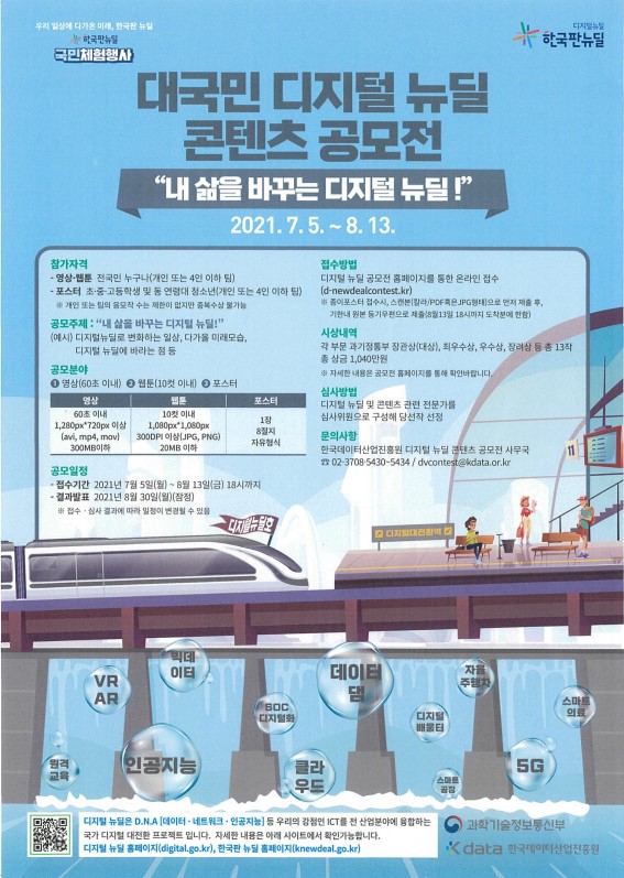 과기정통부와 한국데이터산업진흥원에서는 「한국판 뉴딜」 1주년을 맞아 “대국민 디지털 뉴딜 콘텐츠 공모전”을 아래와 같이 개최 한다고 합니다. 관심있는 분들의 많은 참여 부탁드립니다.