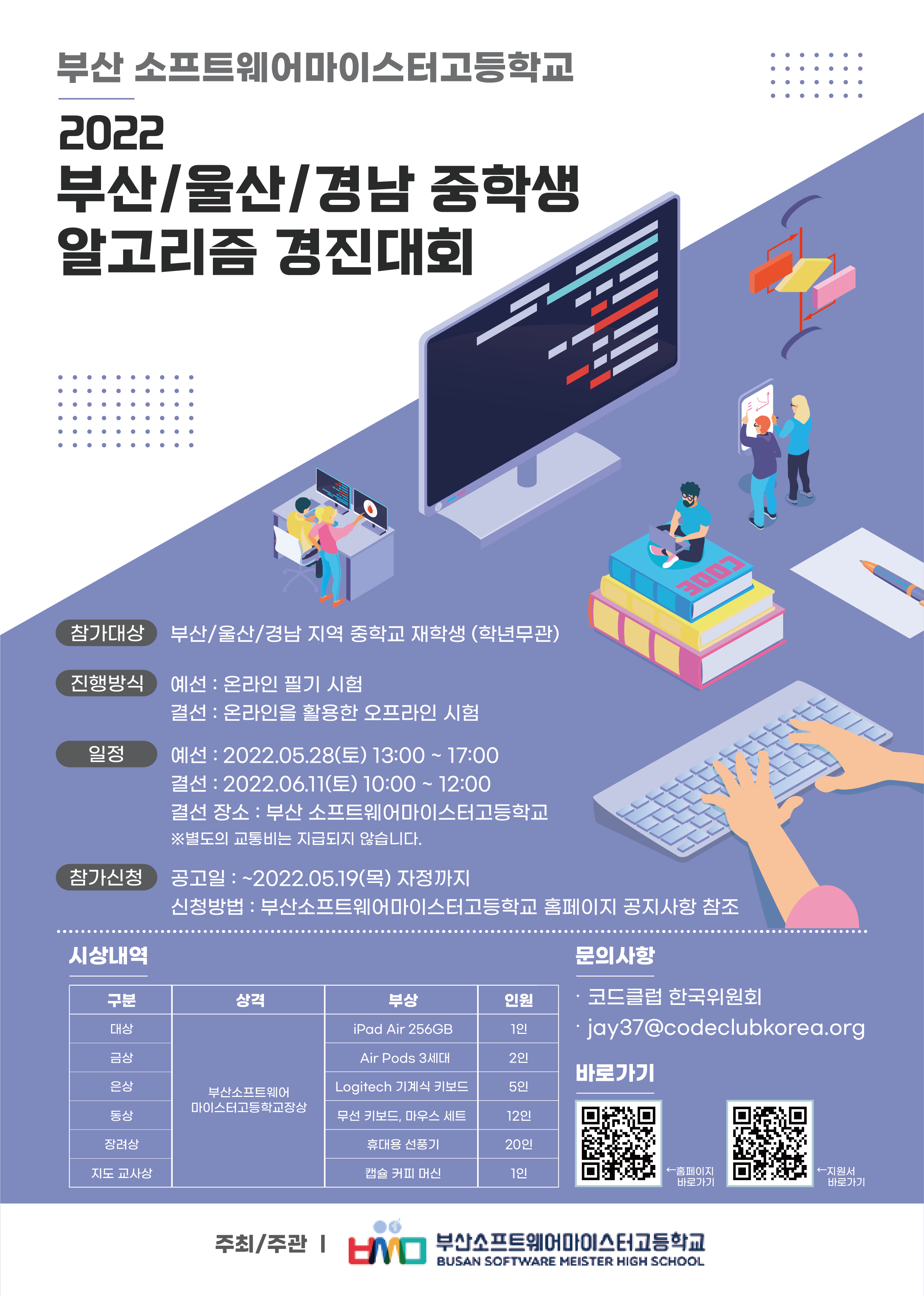 <2022년 부울경 중학생 알고리즘 경진대회 개최 알림> 2022년 부산, 울산, 경남 지역 중학생 알고리즘 경진대회를 개최하오니, 코딩 실력을 겨루고 컴퓨터 과학에 대해 알아갈 수 있는 알고리즘 경진대회에 관심있는 학생들의 많은 참여 부탁드립니다.